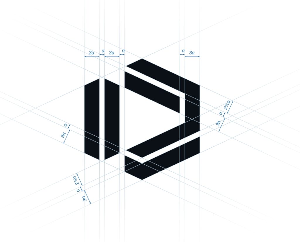 The logomark is developed using a strict geometric framework based on isometric projection. This approach defines every angle, line, and distance, giving the symbol a clear architectural structure and a sense of calculated depth.